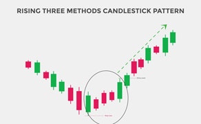 The rising three method is a rare yet significant candlestick pattern. Consisting of five distinct candles, this pattern typically occurs amid an existing uptrend. The emergence of the rising three methods candlestick pattern suggests a pause but not the reversal of the prevailing bullish trend. It means that the stock price can fall for some time before rising again as a sign of the trend continuation.