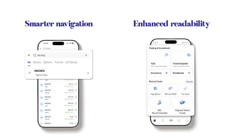 - Unified Search Function: A powerful search bar now works across all asset classes, stocks, F&O contracts, mutual funds, and US stocks, allowing you to find what you need from a single search point.
