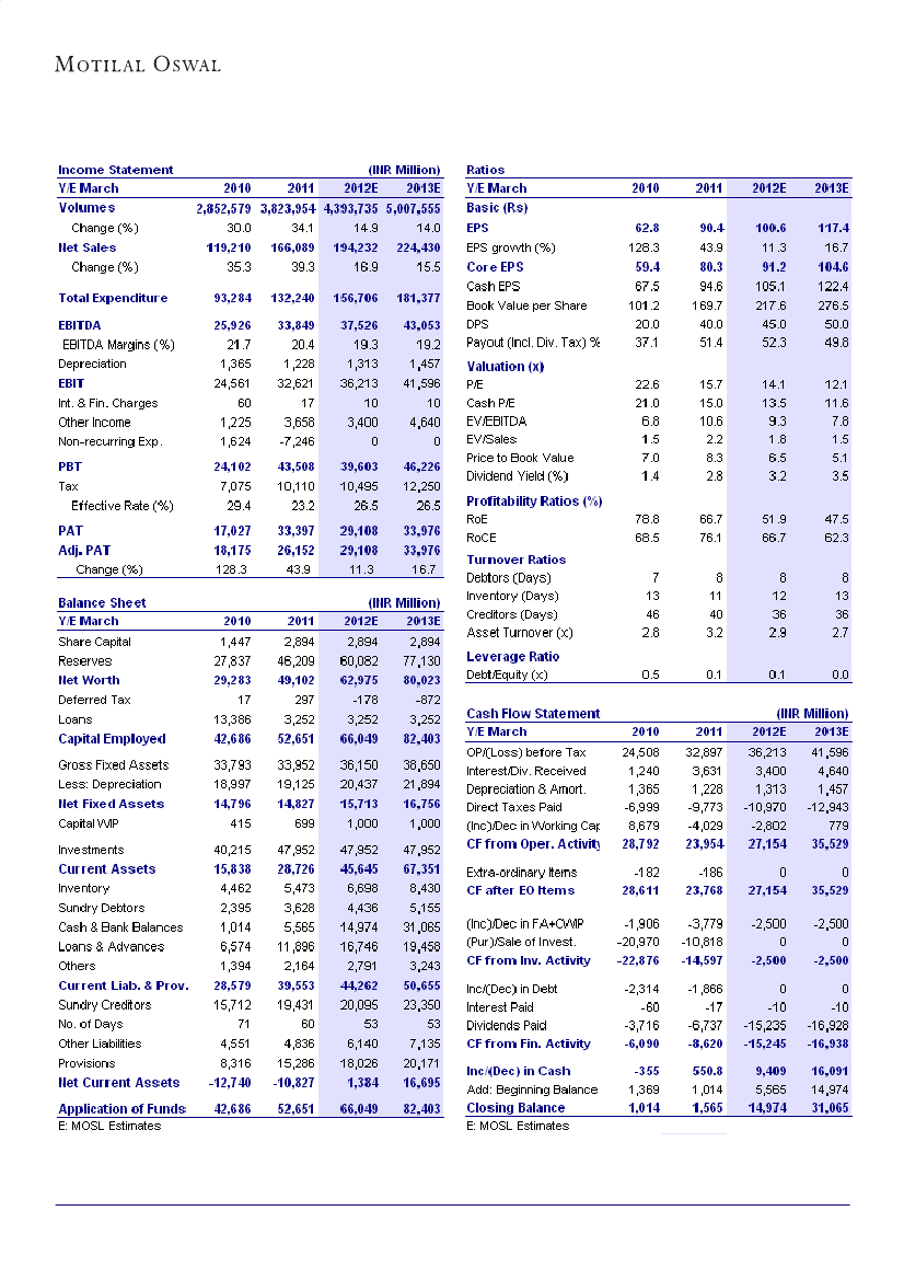 14.1x FY12E EPS of INR100.6 and 12.1x FY13E EPS of INR117.4. Maintain