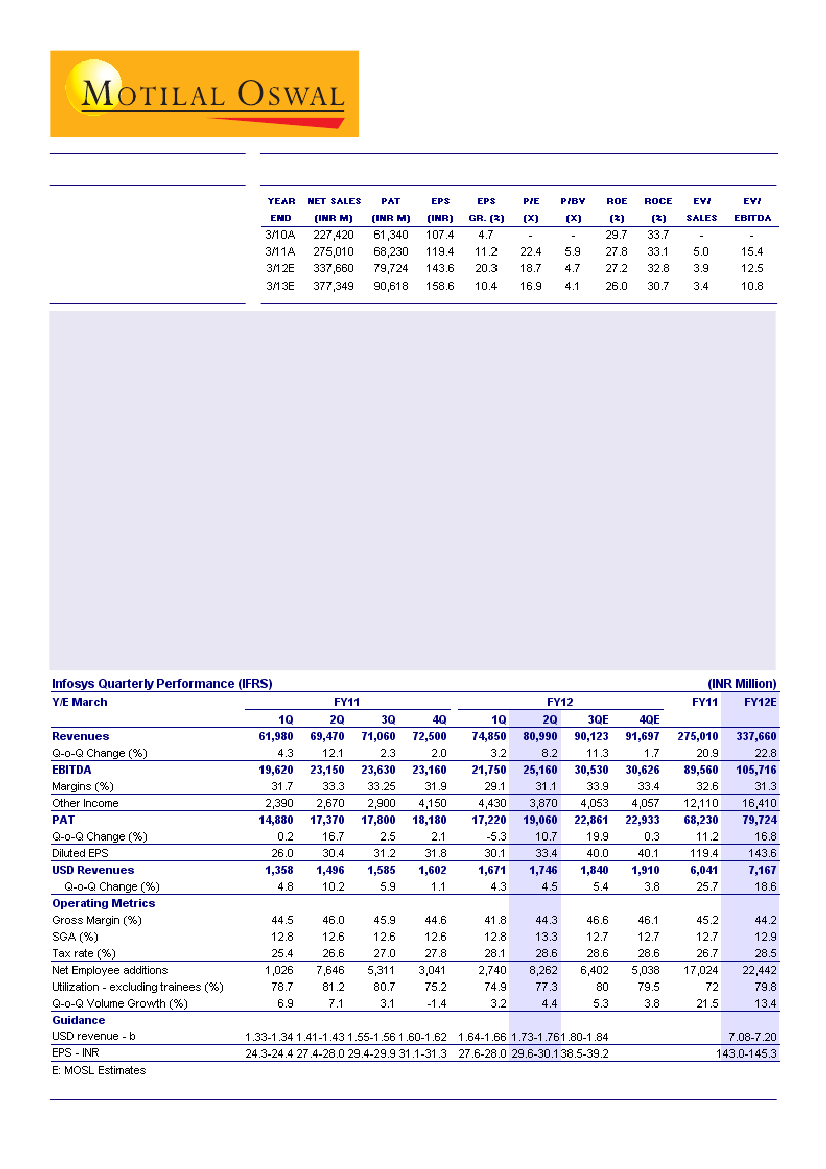 Infosys Technologies (INFO) posted strong volume growth in 2QFY12 (4.4% QoQ against our expectation of 3.7%)