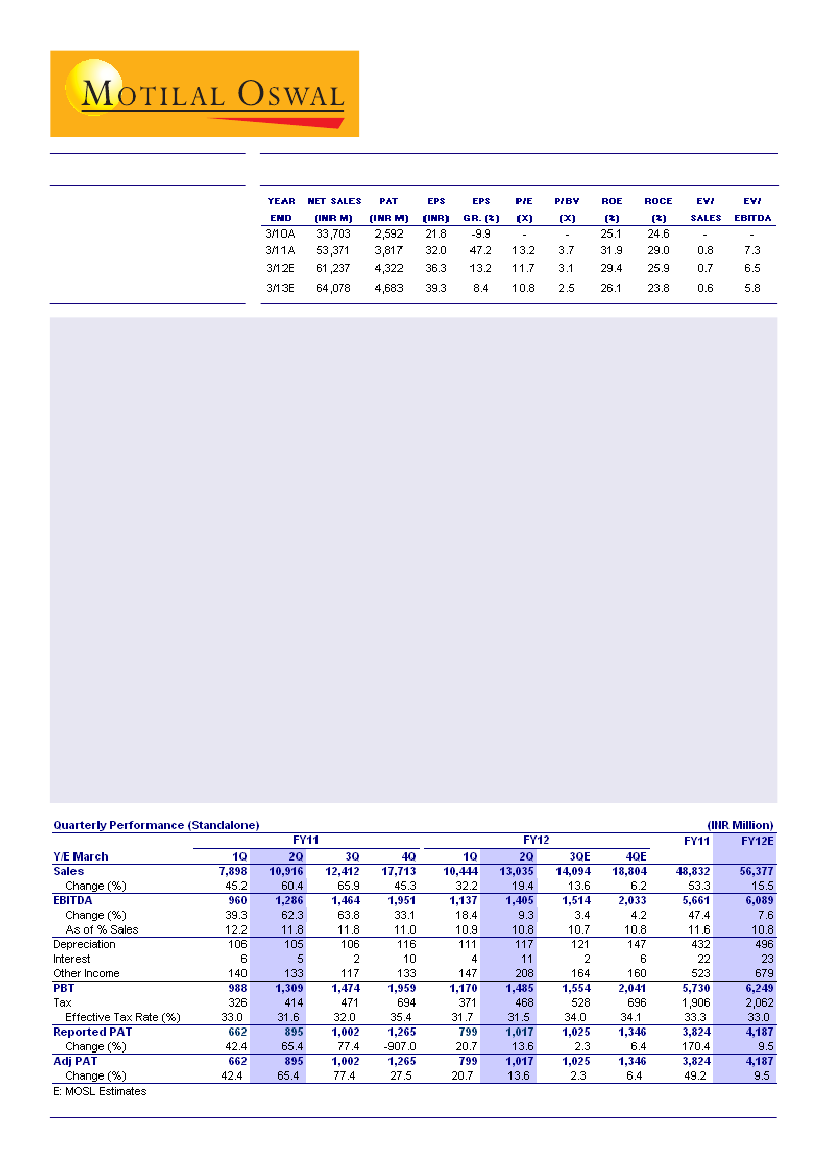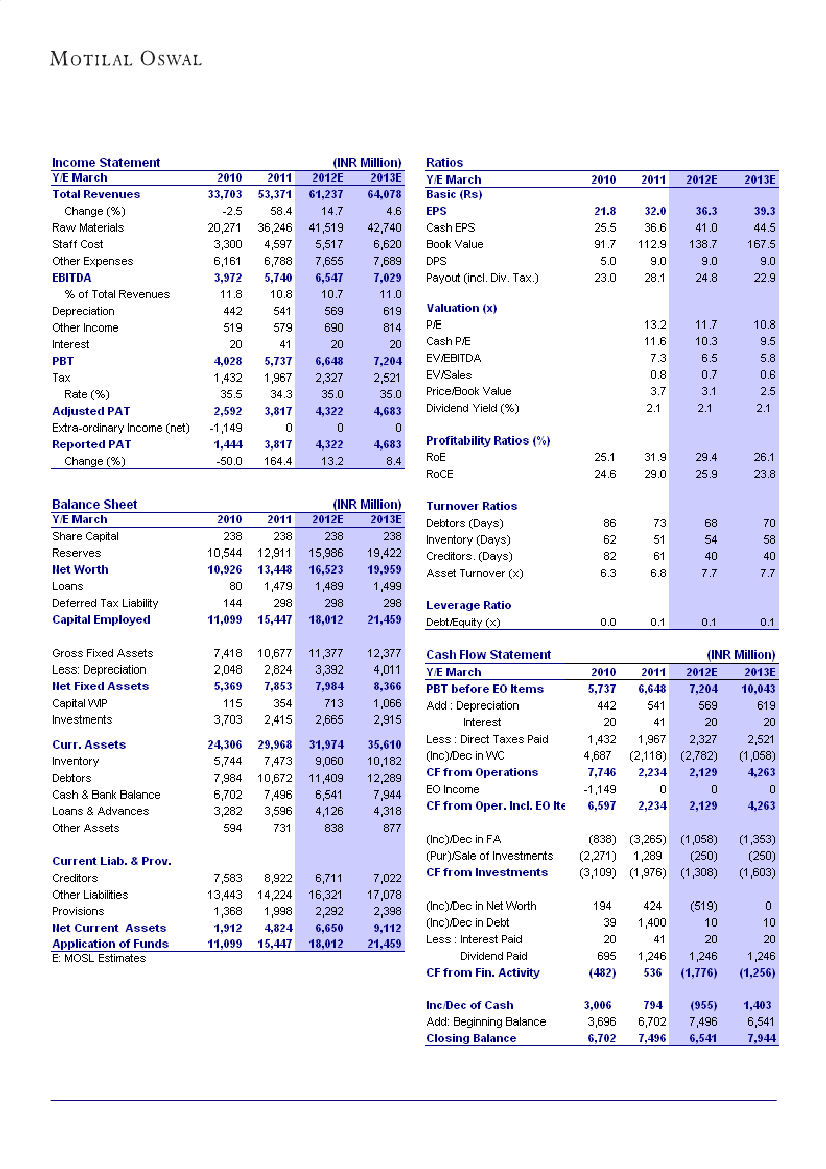 estimate EPS of INR36.3 (up 13%) and INR39.3 (up 8%) in FY12 and FY13, respectively. We maintain a