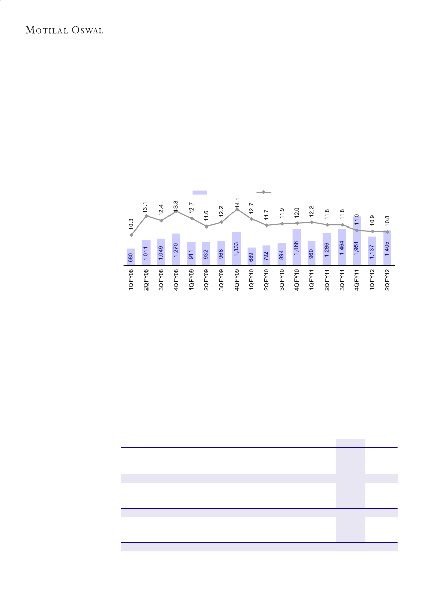 2QFY12 EBITDA margins were 10.8%, down 100bp
