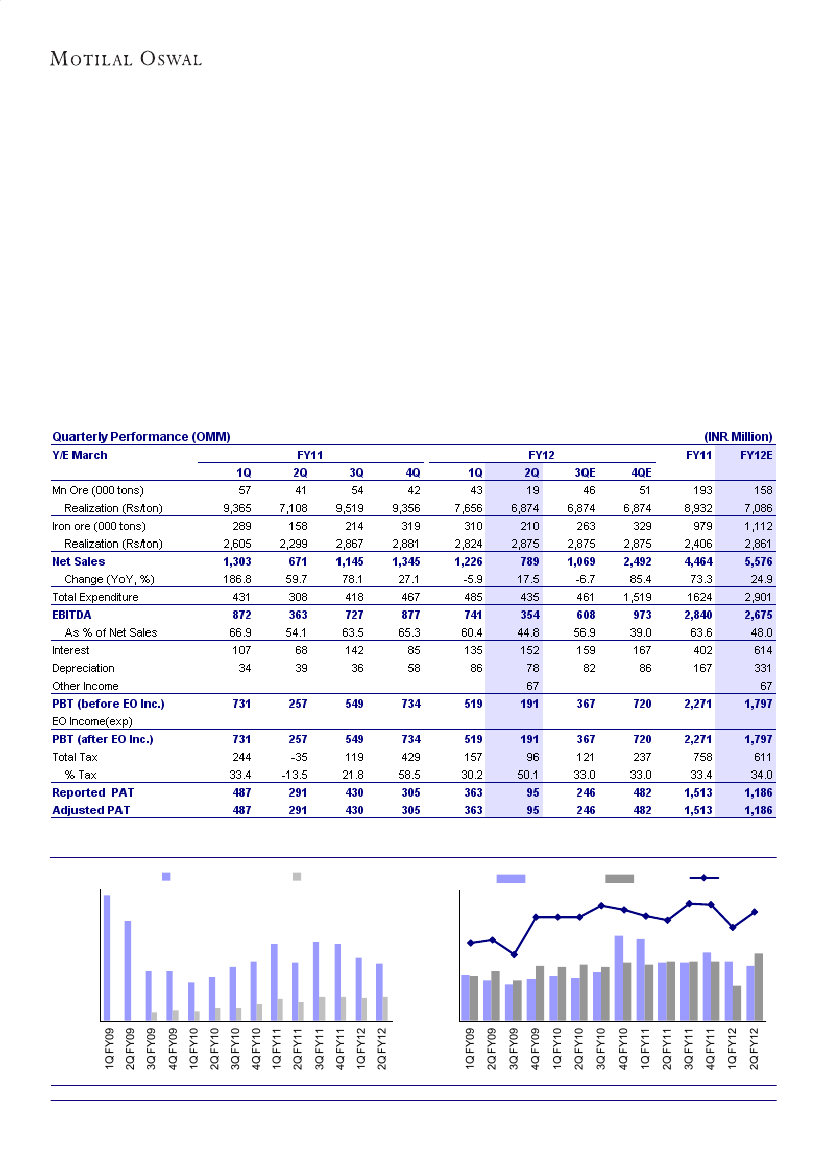 Orissa Manganese & Minerals (OMM) EBITDA declined 52% QoQ (3% YoY) to INR354m. Adjusted PAT decreased