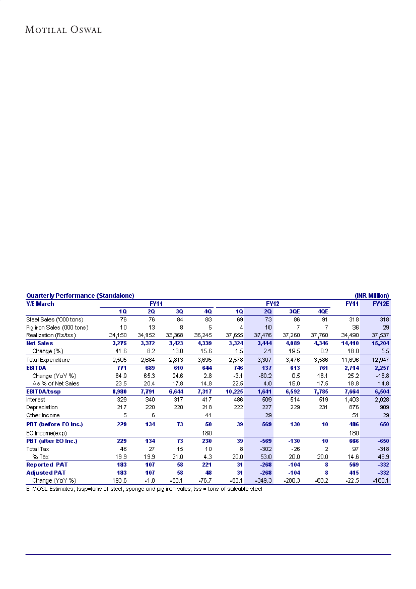 Standalone adjusted loss of INR268m was on high input cost and flat realizations. External iron ore cost increased