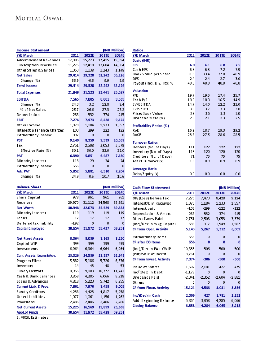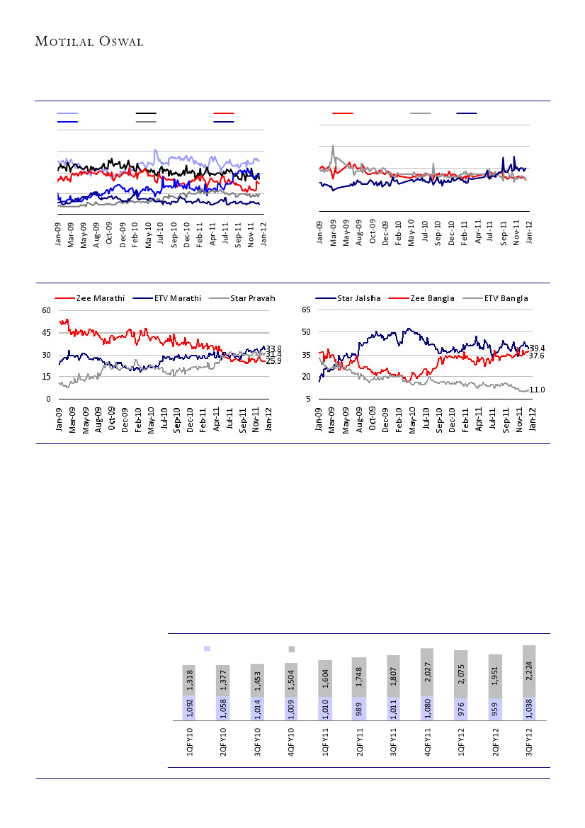 estimate. Ad revenue declined 10% YoY to INR3.96b due to high base of sports related revenue in 3QFY11,