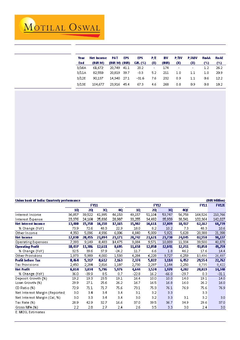 Union Bank of India 3QFY12 PAT stood at ~INR2b (v/s est. of 5.1b). While operating profit was 4% above est.,