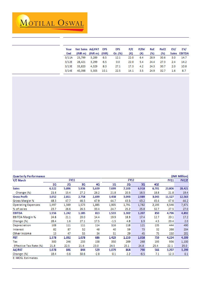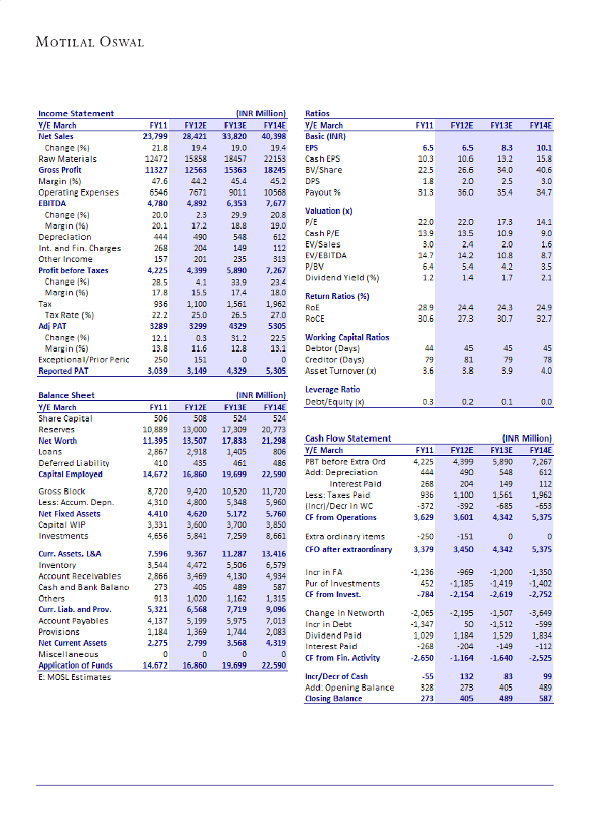 outlook. It trades at 17.3xFY13E EPS of INR8.3 and 14.1xFY14E EPS of INR10.1. Maintain