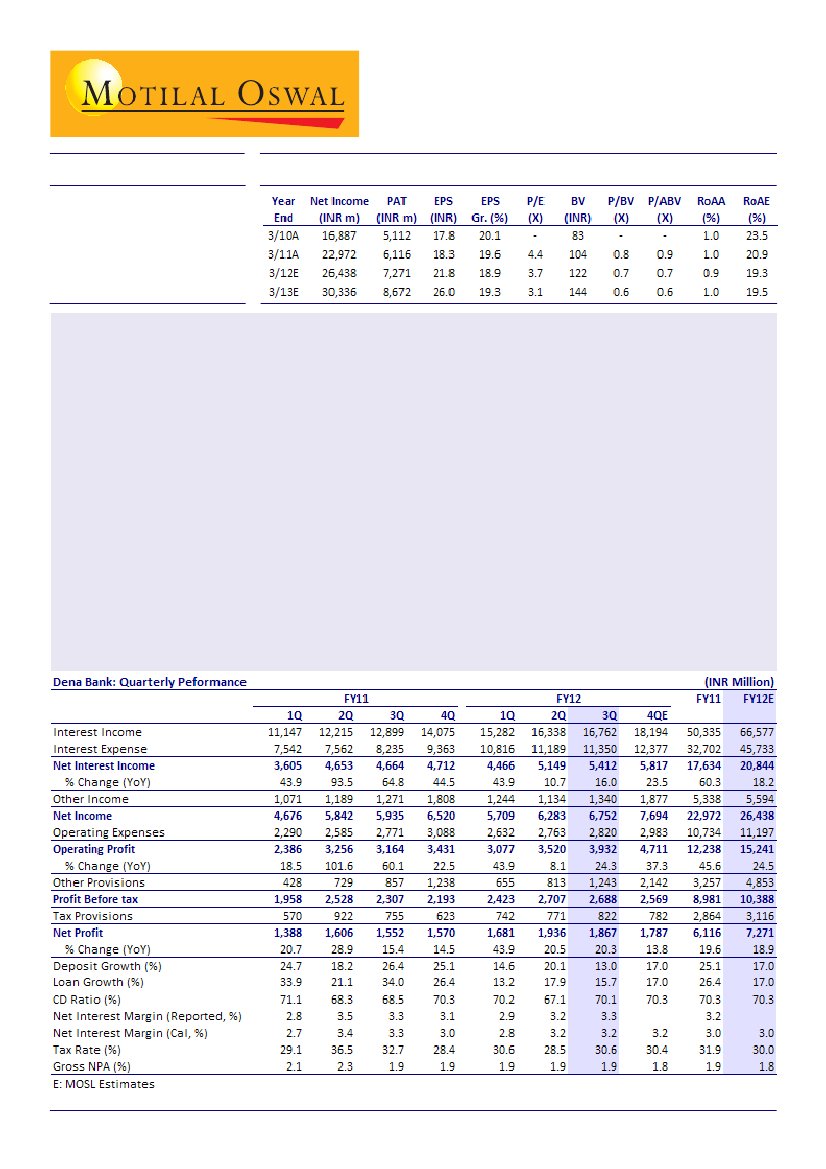 Dena Bank (DBNK) reported a PAT of ~INR1.9b for 3QFY12, up 20% YoY. Reported NIM improved 11bp QoQ to 3.3%,