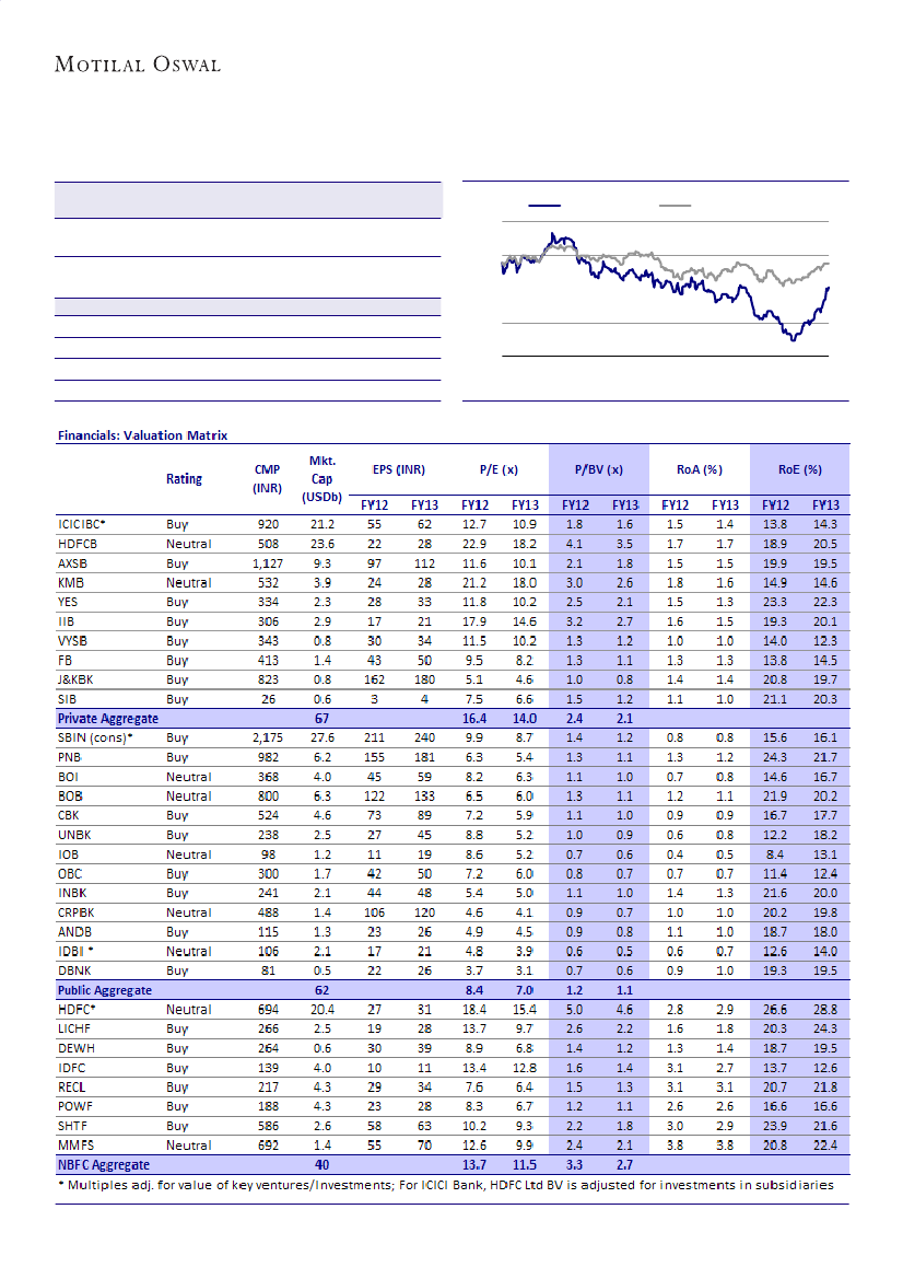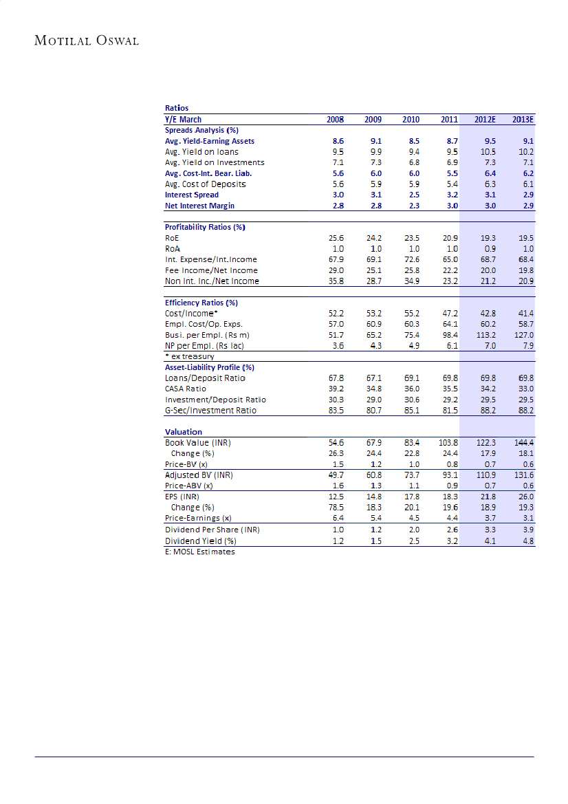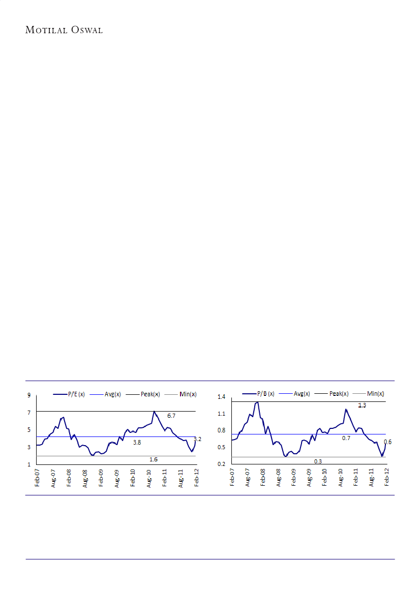 in FY12 and INR144 in FY13. The stock trades at 3.7x FY12E and 3.1x FY13E EPS, and 0.7x FY12E and 0.6x FY13E BV. RoA
