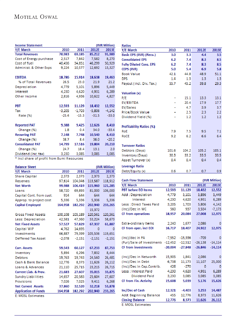 3QFY11. However, EBIT from coal SPVs was just INR1.4b as against INR4.3b in 3QFY11 and INR6b in 2QFY12. In
