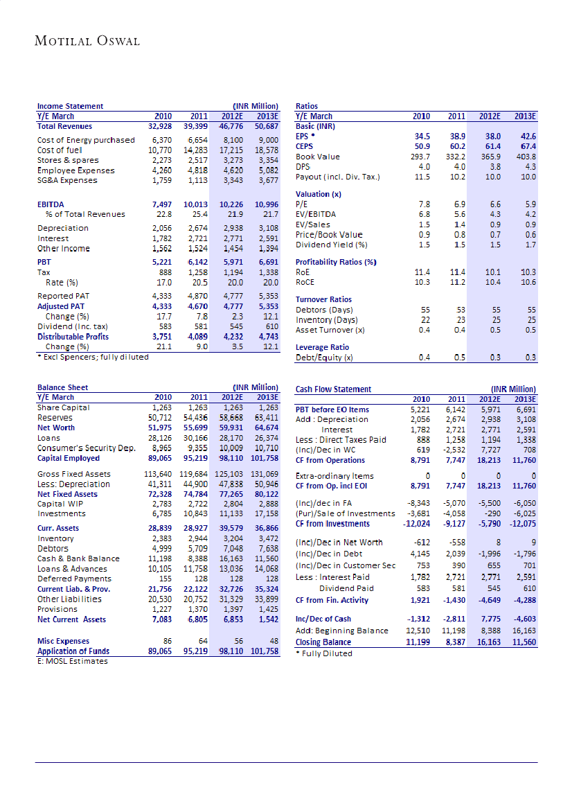 We expect CESC to report a standalone PAT of INR4.8b in FY12 (up 2% YoY) and INR5.3b in