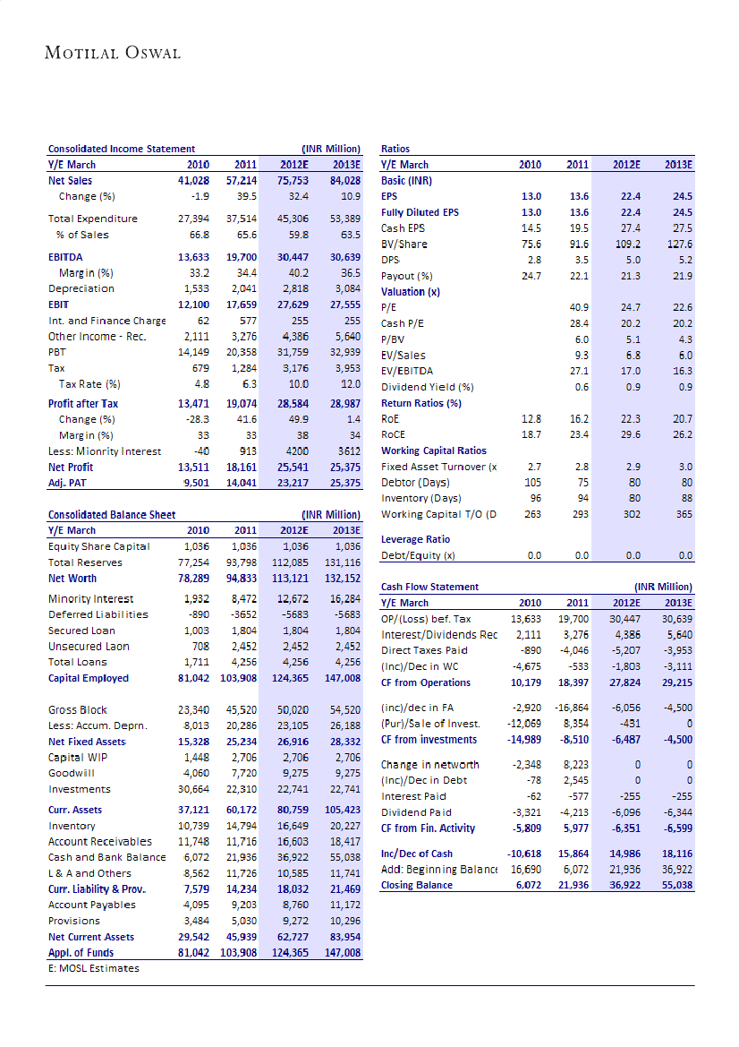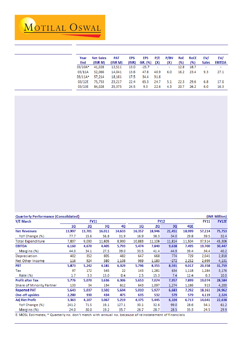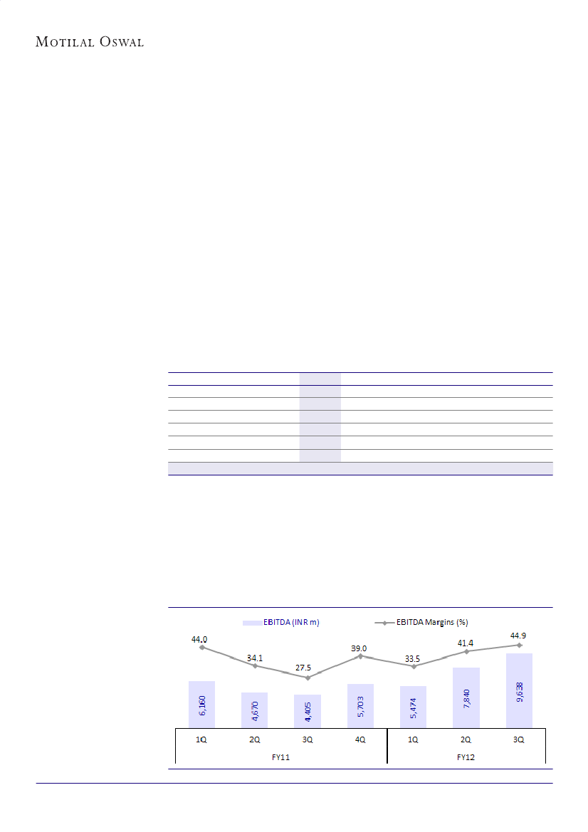 currency. EBITDA surged 119% YoY to INR9.64b with EBITDA margin at 44.9% compared to 27.5% for 3QFY11.