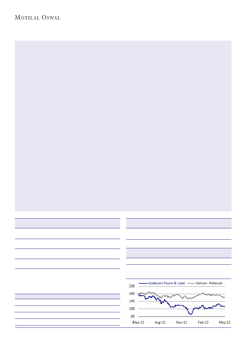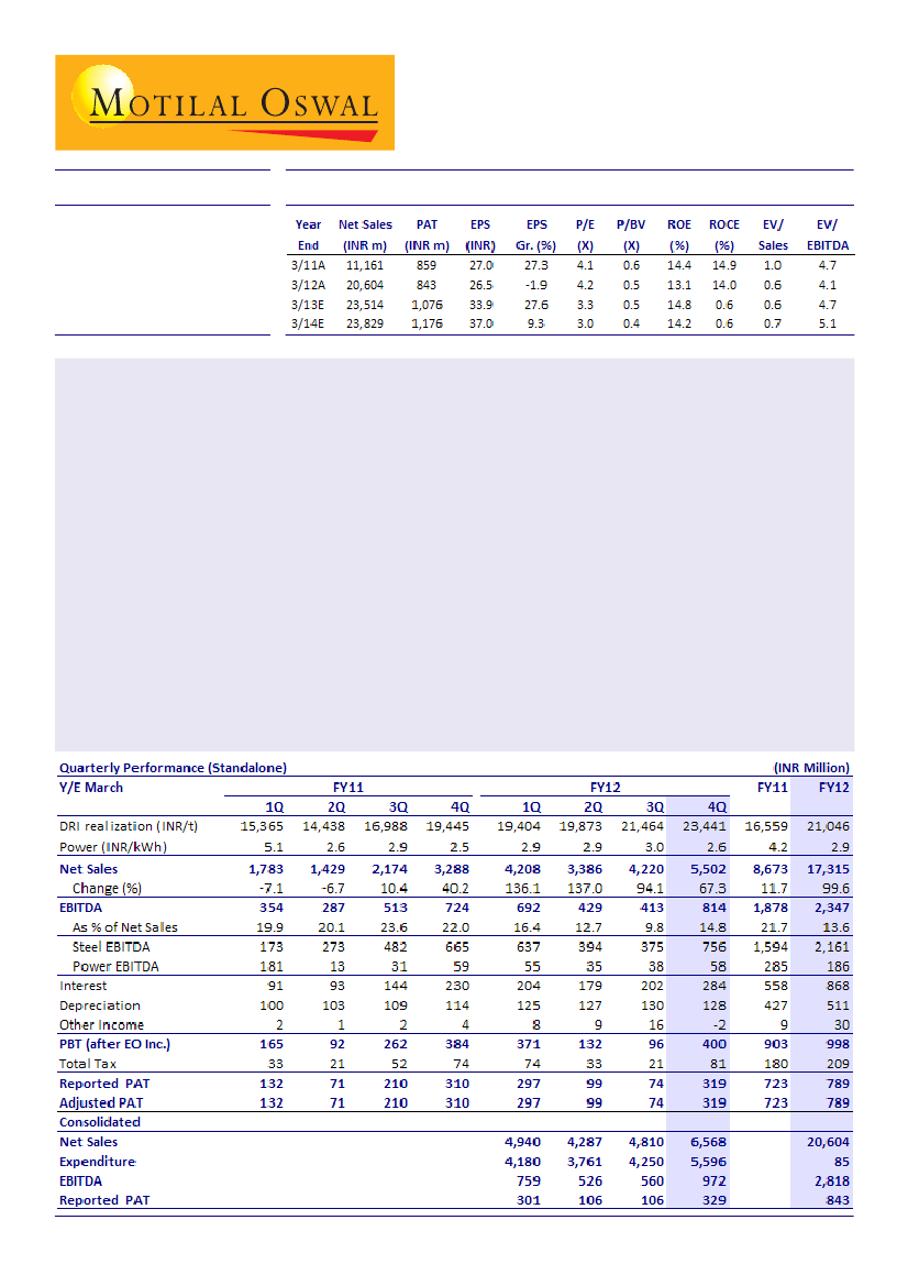 Godawari Power and Ispat (GODPI) posted 328% QoQ growth in adjusted standalone PAT for 4QFY12 to INR319m