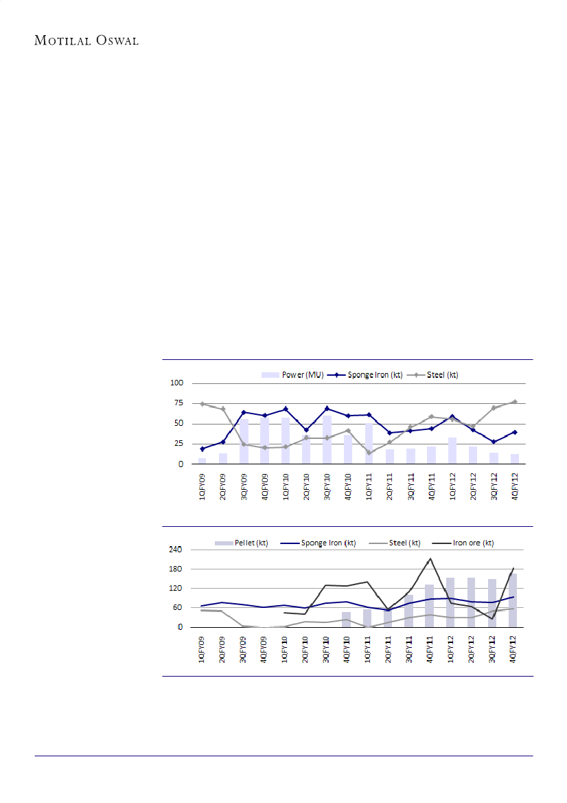 Iron ore production increased 7x QoQ to 183k tons, as production returned to normal levels. In 3QFY12,
