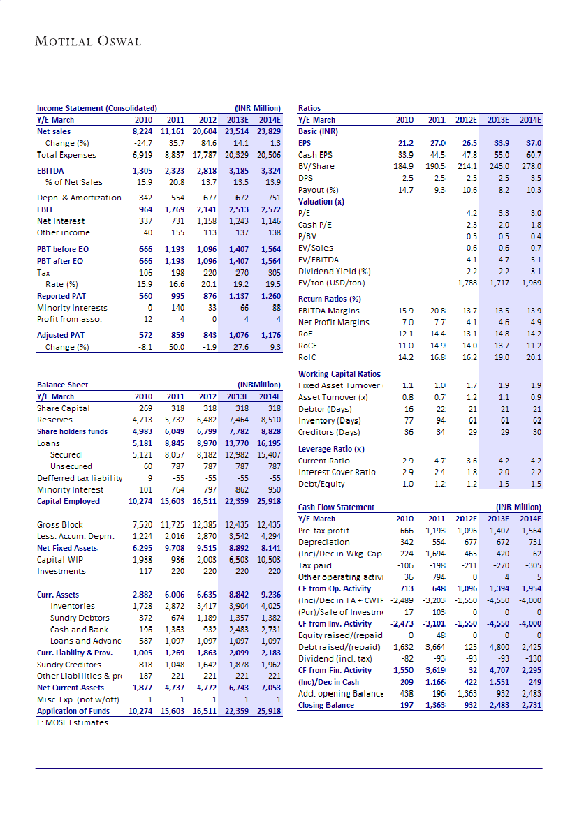 The stock is trading at 3.3x FY13E EPS, 0.5x FY13E BV, and at an EV of 4.7x FY13E EBITDA. Maintain