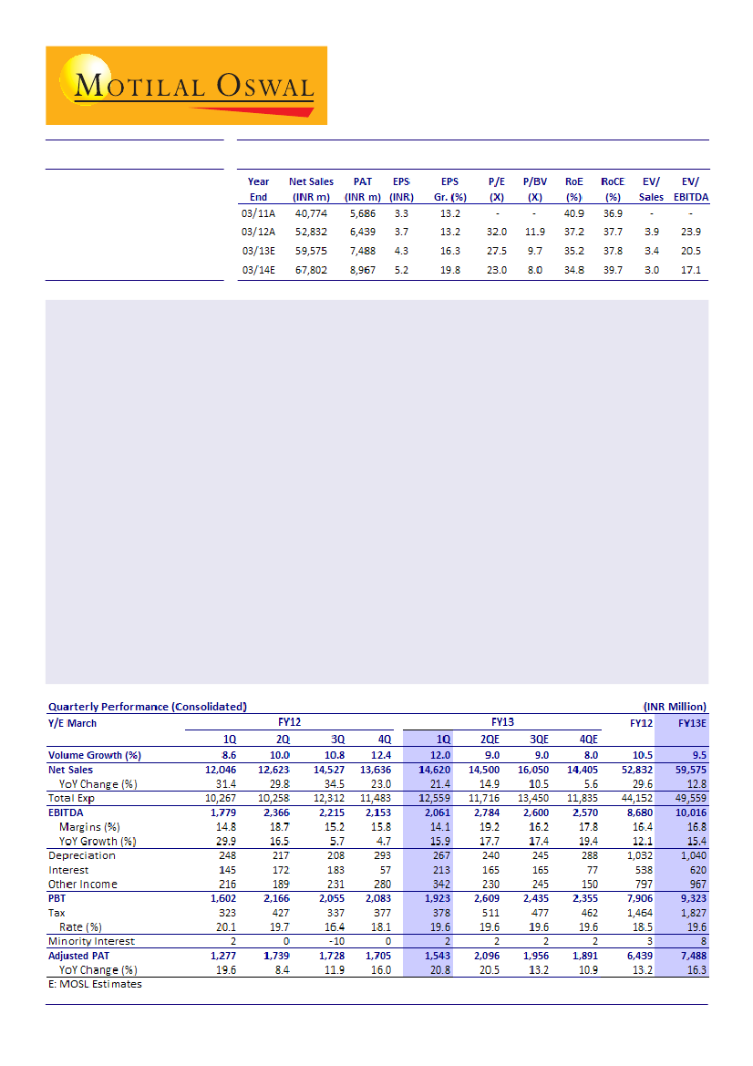 The management has indicated high single-digit volume growth for FY13. It expects competitive intensity to