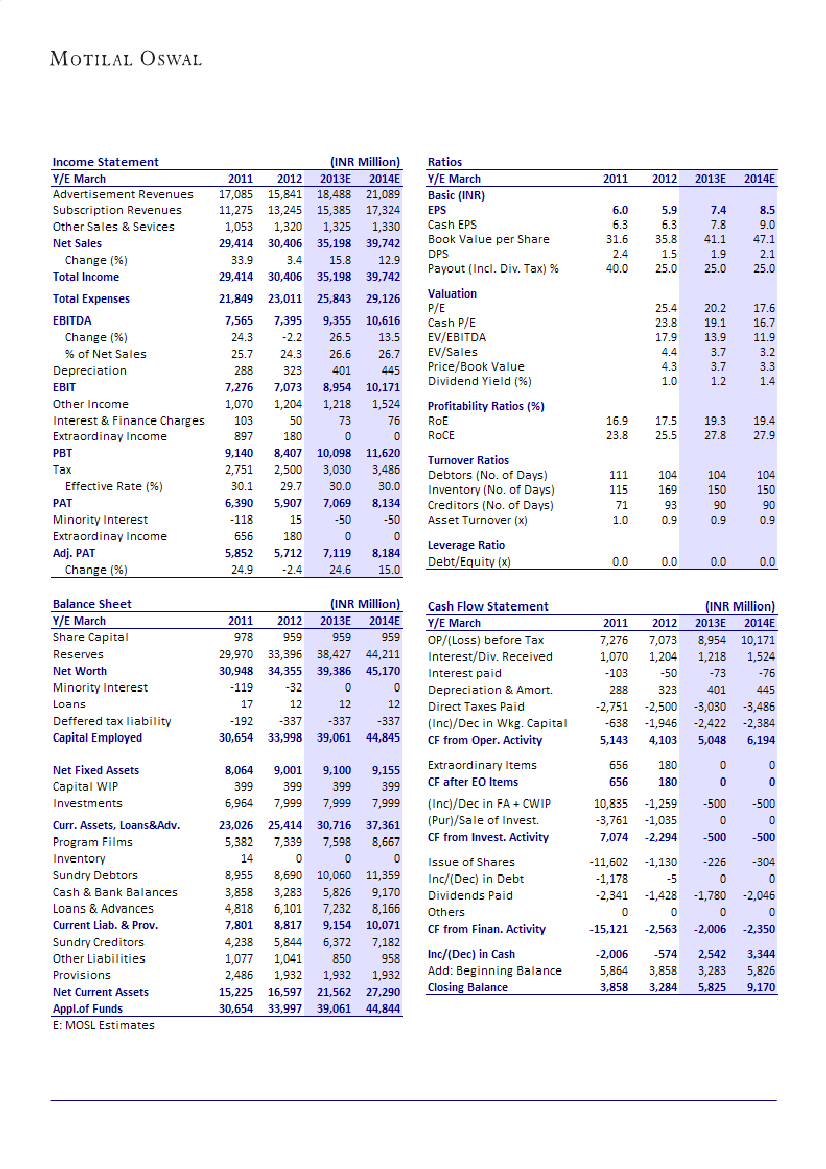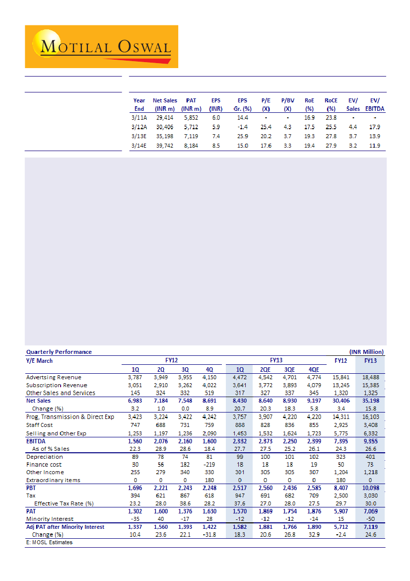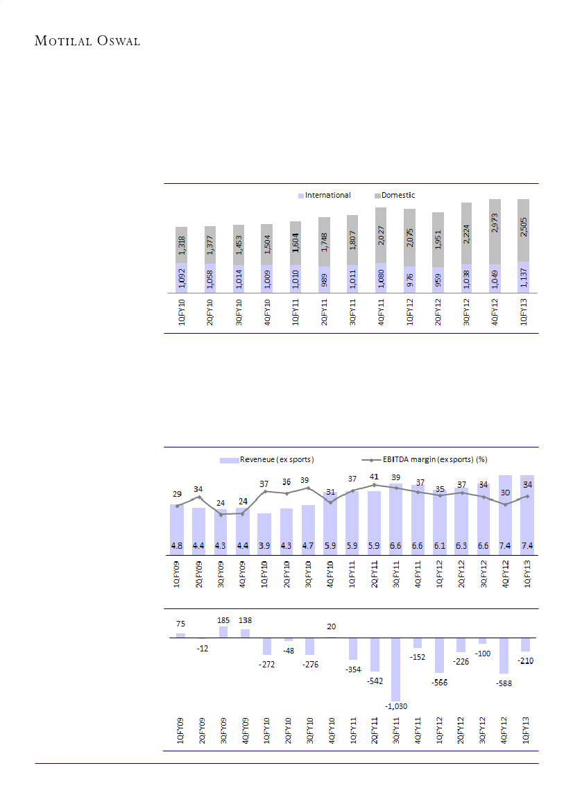 growth in FY13/14, stable ex-sports margin at 34%/33%, and sports loss of INR1b/0.8b.