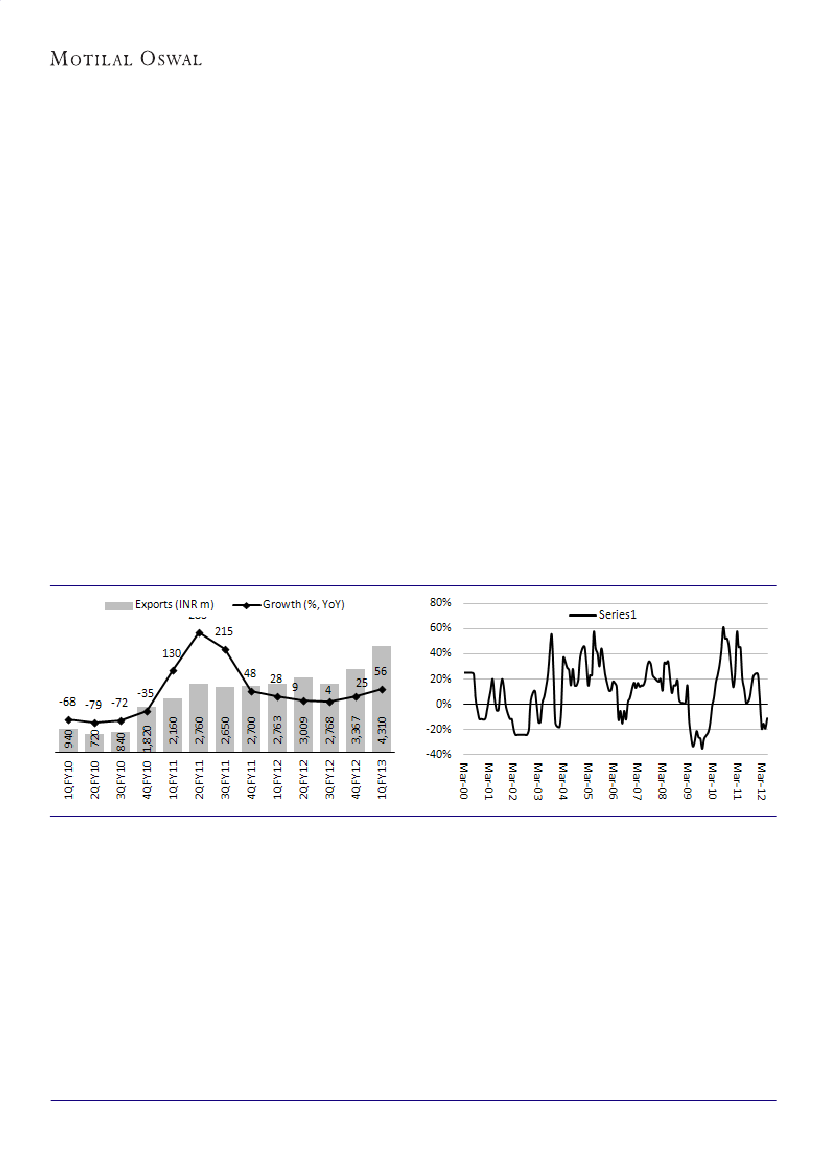 favorable currency movement. Management expects 20% YoY growth in exports in FY13 on the back of INR2b
