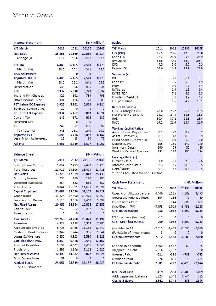 stock trades at 6.4x FY13E and 5.7x FY14E EPS. We maintain