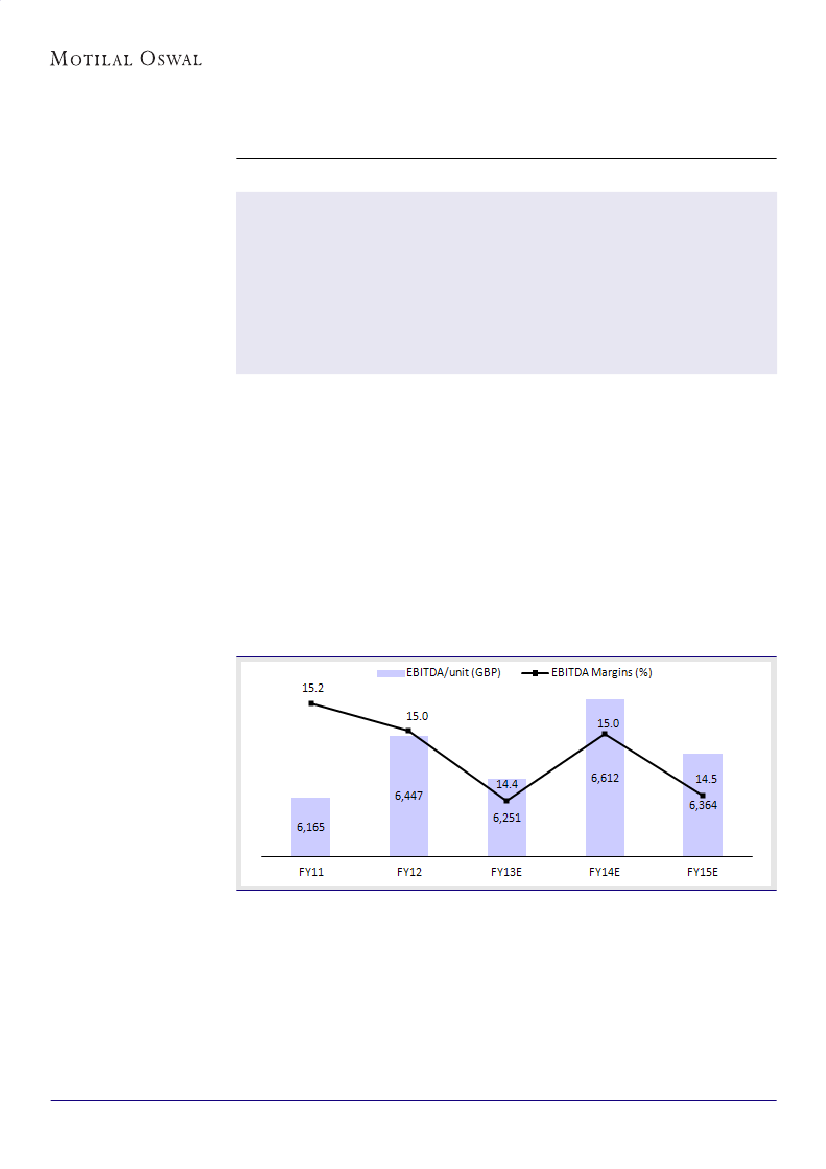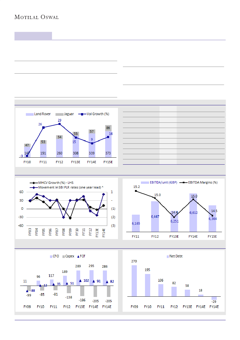 We expect Consolidated EBITDA margin to recover 50bp in FY14 to 14.2%. JLR's