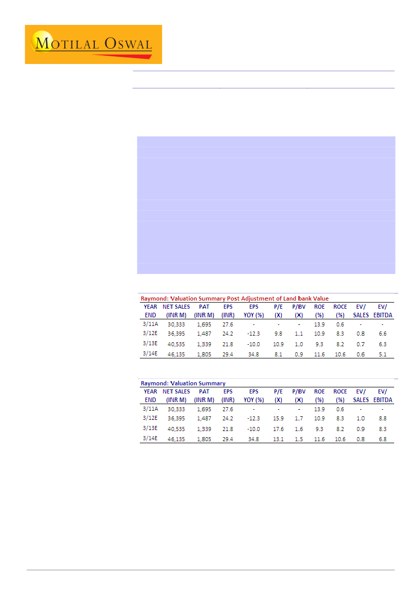 Adjusting for real estate value, Raymond trades at FY14E P/E of 8x and EV/