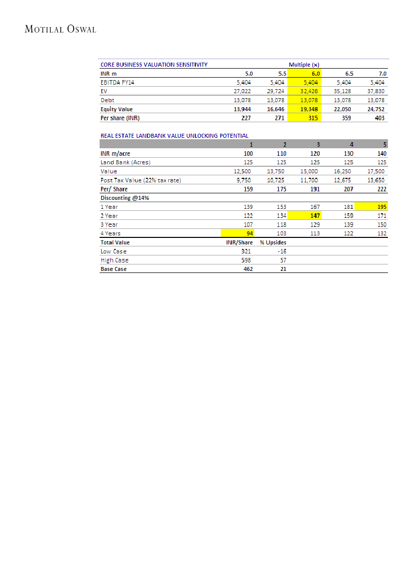 intrinsic EV/EBITDA of 6x FY14E and land bank value of INR147/ share.