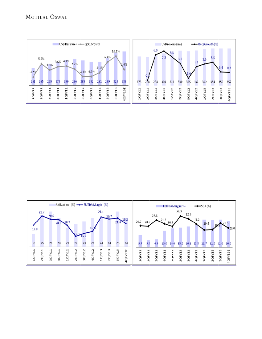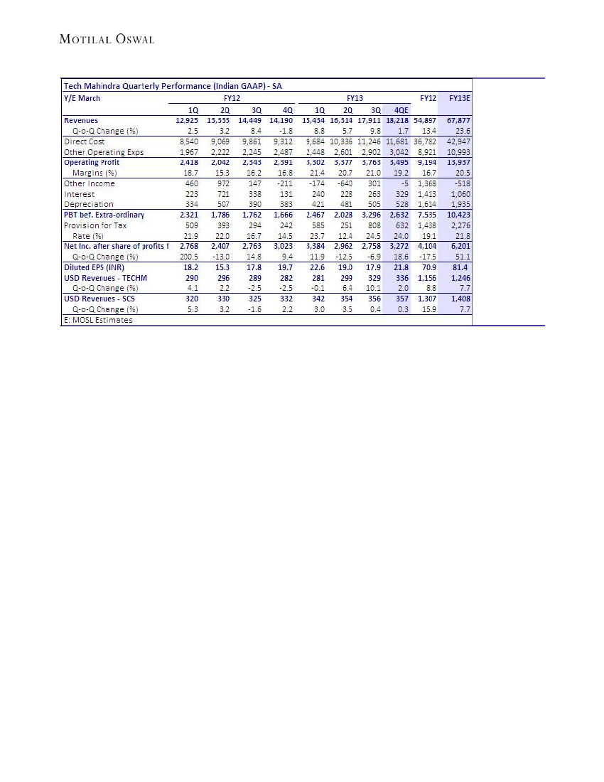TECHM trades at 9.8x FY14E and 8.5x FY15E EPS. We expect USD revenue CAGR