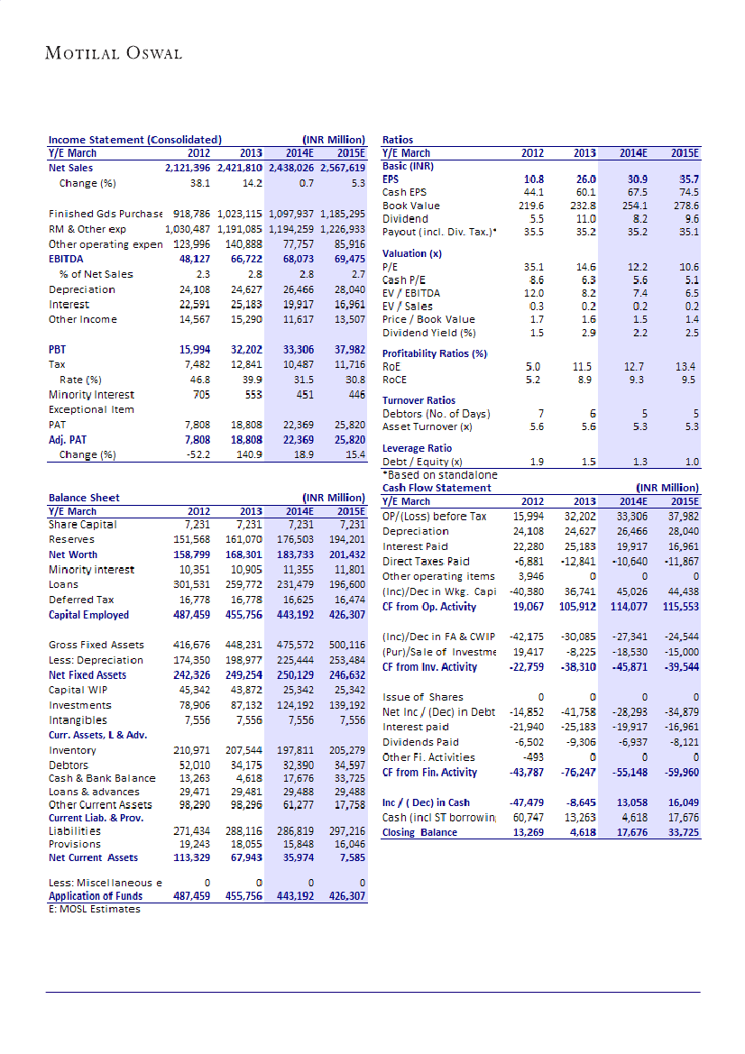 FY14E EPS of INR31 and 0.7x FY14E BV, adjusted for investments. Maintain