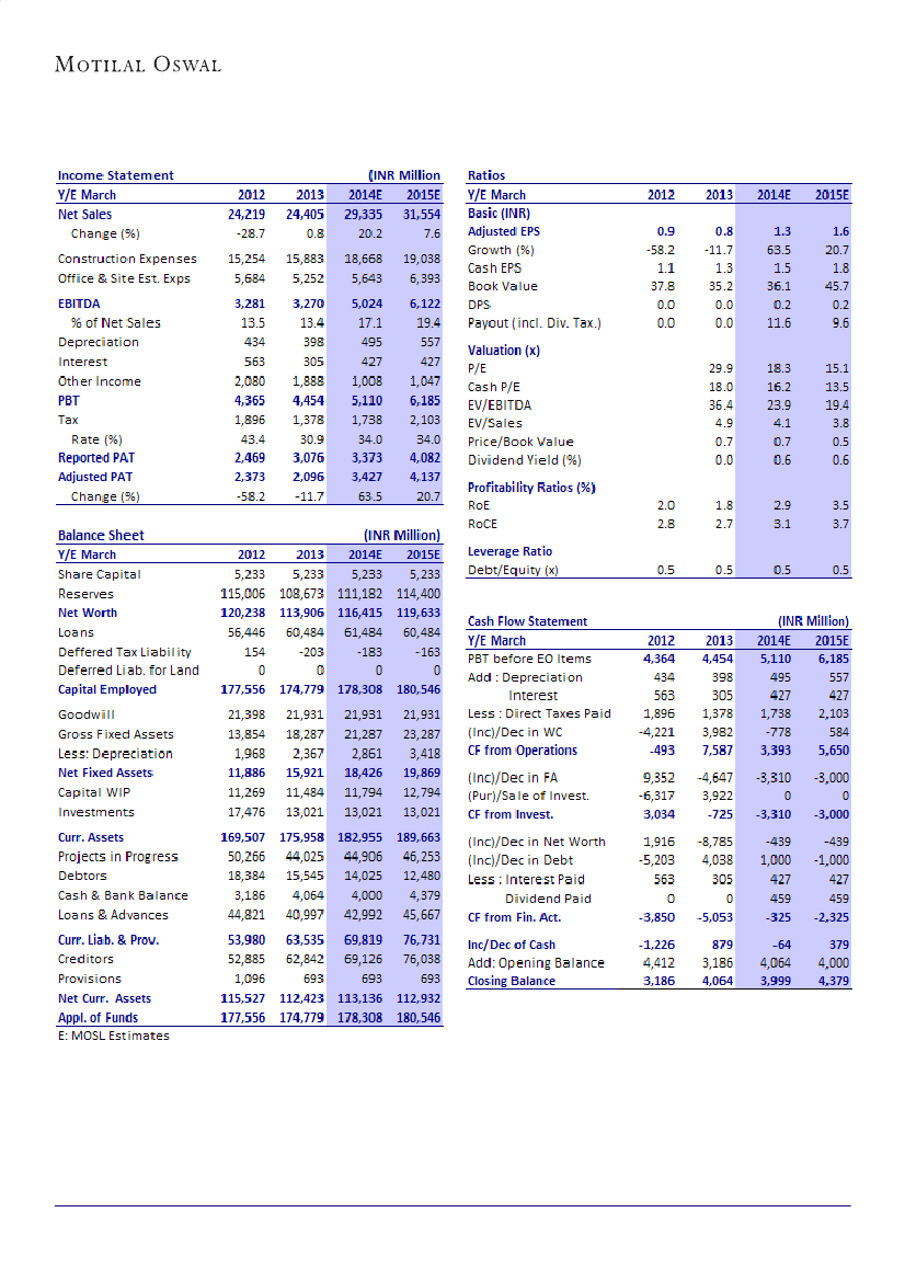 The stock trades at 0.5x FY15E BV, 15.1x FY15E EPS and 48% discount to our