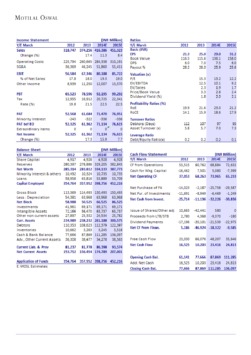 Our target price of INR470 discounts FY15E EPS by 15x, implying 23% upside.