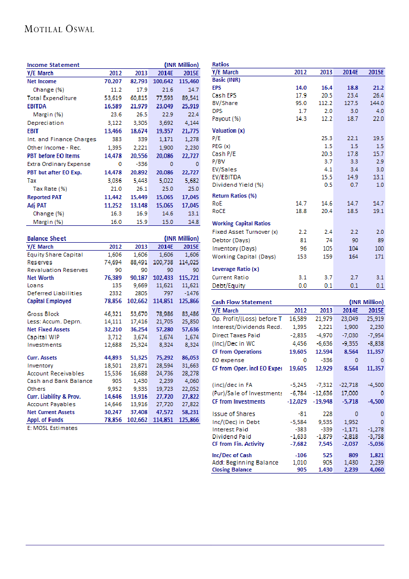 INR21.2 for FY15E (up 13% YoY). The stock trades at 22.1x FY14E and 19.5x FY15E