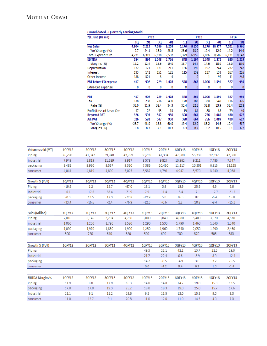 During Q2FY14, company saw 2.6% volume growth in piping segment, 21.2%