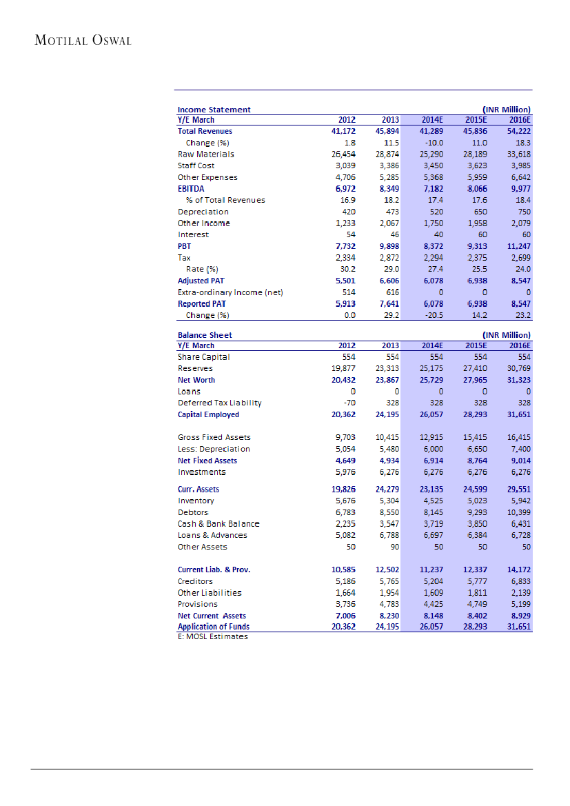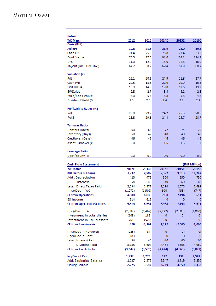 At the CMP of INR 546, KKC trades 21.8 / 17.7x its FY15E / FY16E EPS
