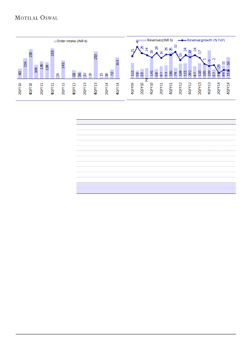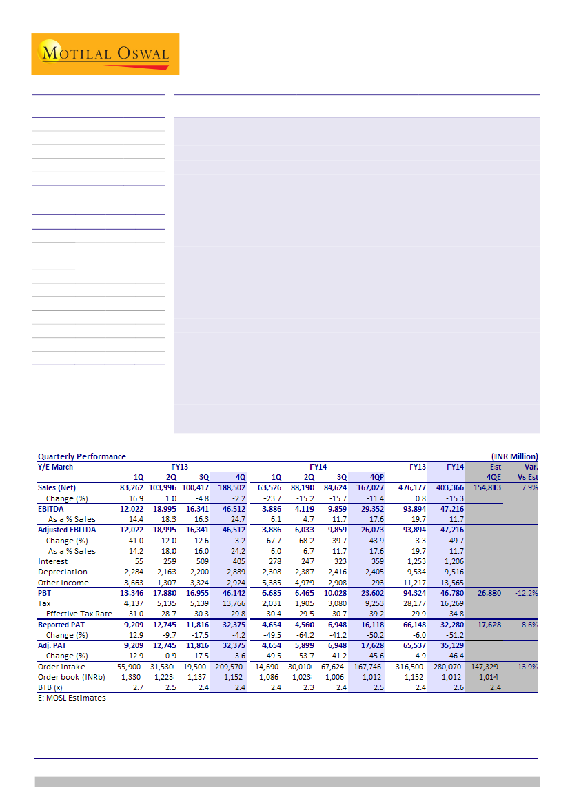 Order intake at INR280b in FY14 (vs INR317b in FY13), entails 4QFY14