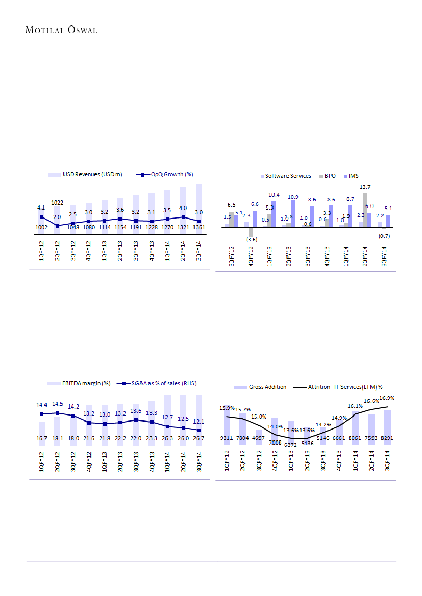 revenue for 3QFY14 grew 3% QoQ to USD1,361m, in line with our estimate of