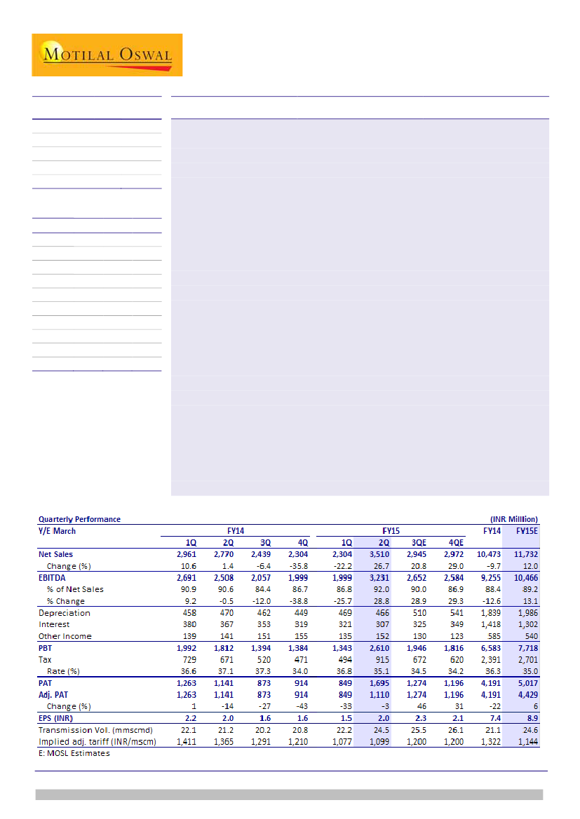 Implied tariff in 2QFY15 stood at INR1,099/mscm (v/s INR1,365/mscm in 2QFY14