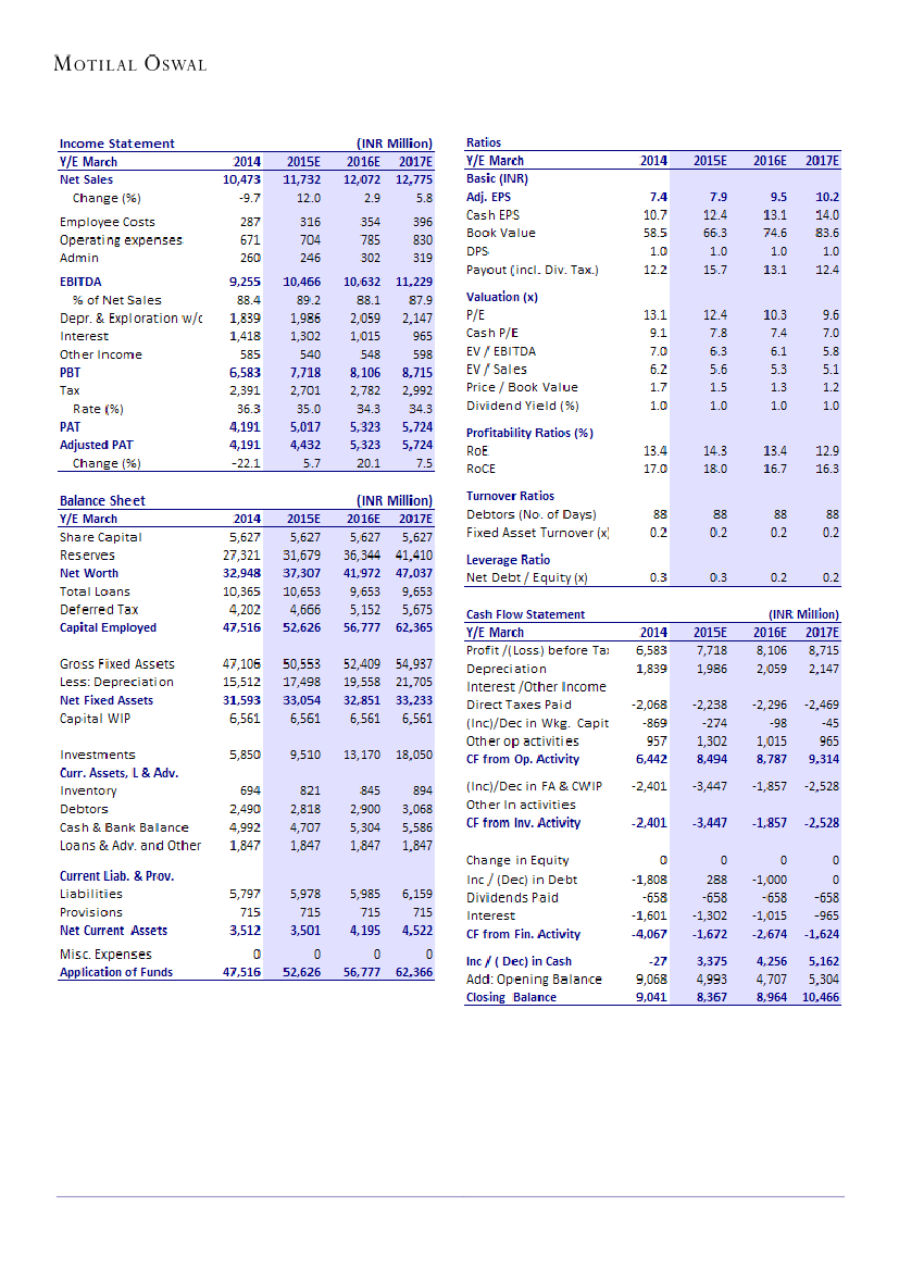 The stock trades at 10.3x FY16E EPS of INR9.5. Our SOTP-based