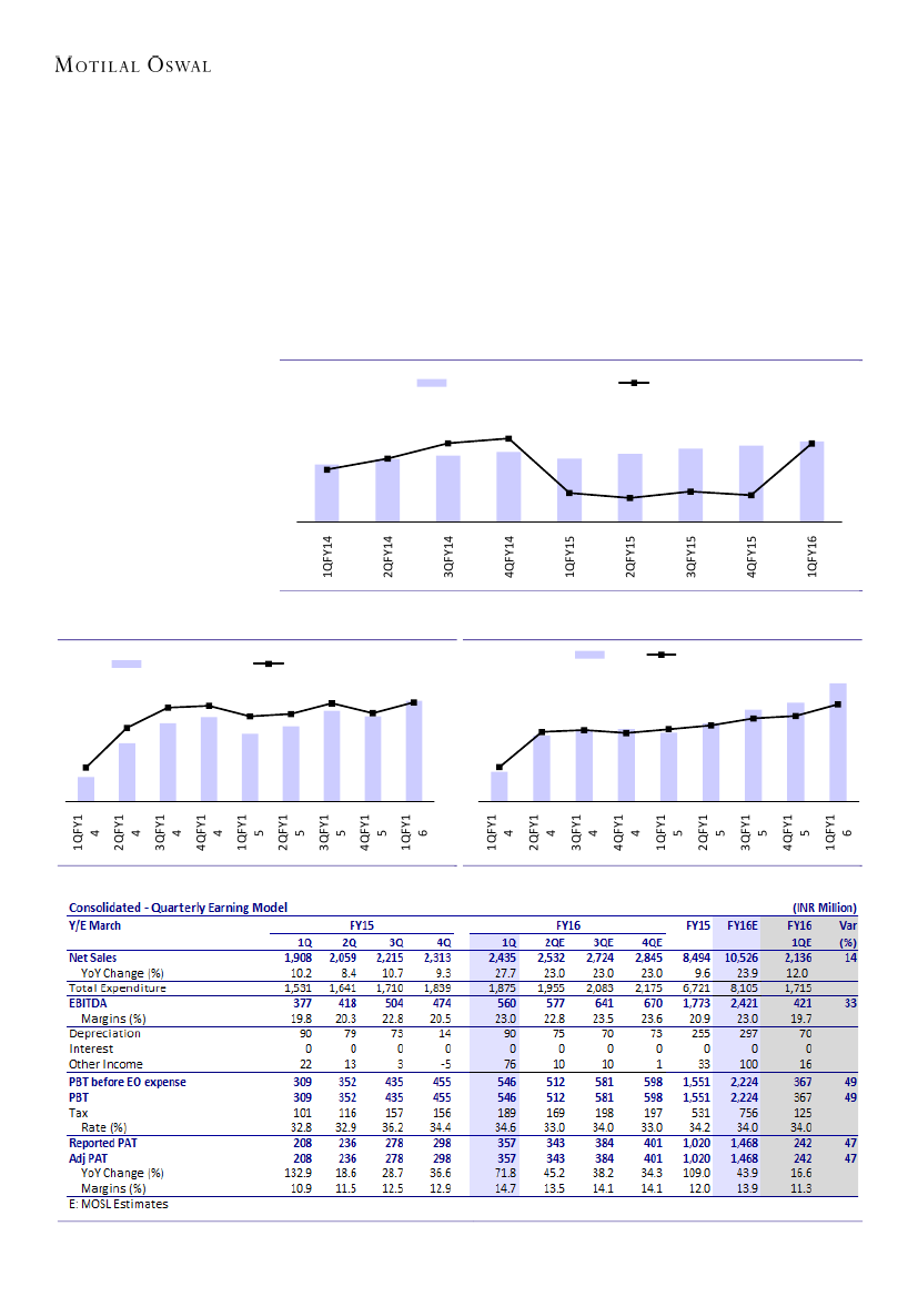 INR560m (est INR377m), EBITDA margins stood at 23% in 1QFY16 (est 19.7%) as