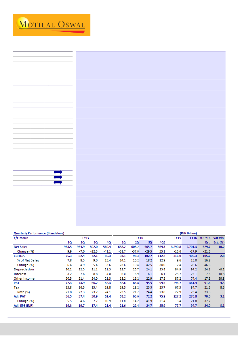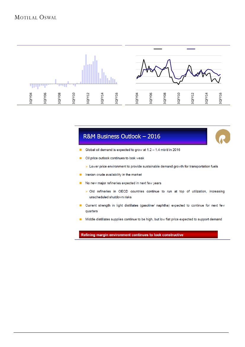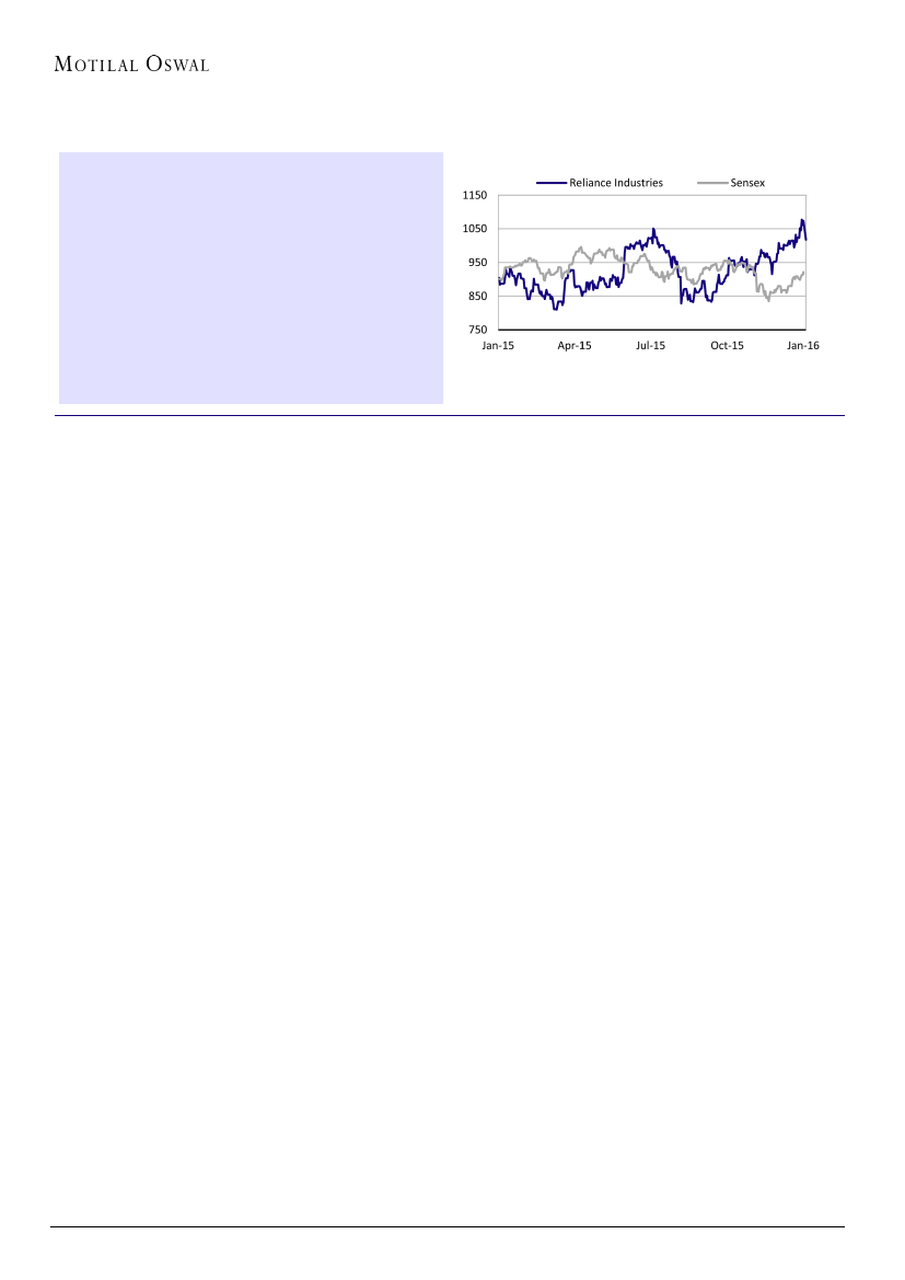 Reliance Industries’ (RIL) reported largely in-line 3QFY16 EBITDA at INR103b (43% YoY
