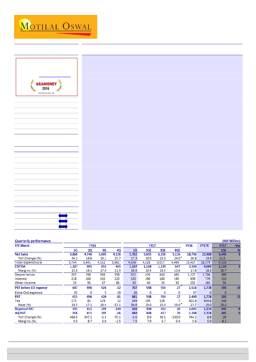 PAT came in at INR444m (est. of INR445m), down from INR458m in 1QFY16.