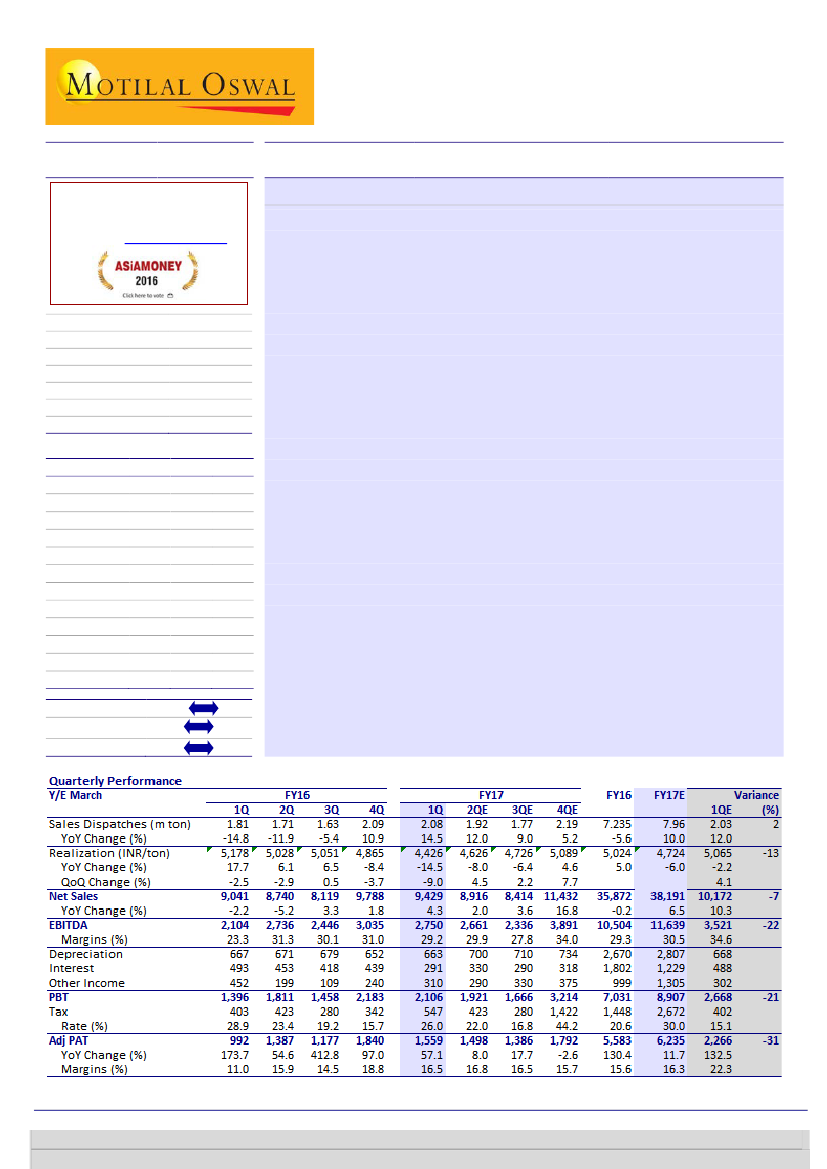 1QFY17, driven by spurt in southern demand. Blended realization declined 3%