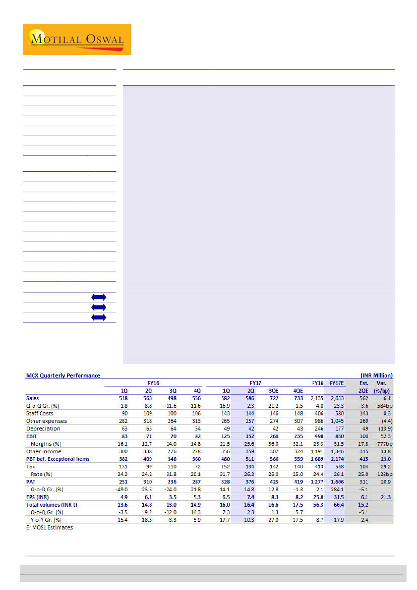 MCX’s 2QFY17 revenue grew 2.3% QoQ and 5.7% YoY to INR596m, above our
