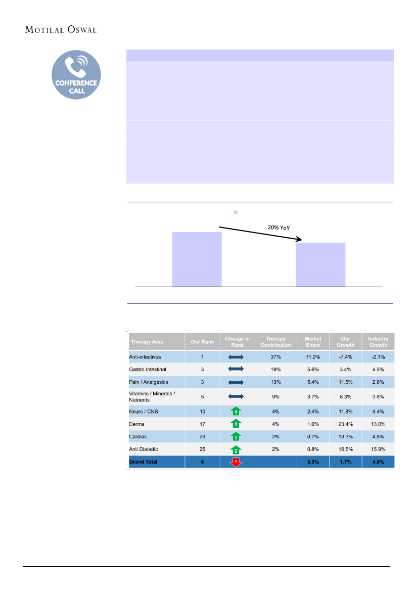 Alkem’s domestic business declined 21% YoY to INR8.7b. The company lost