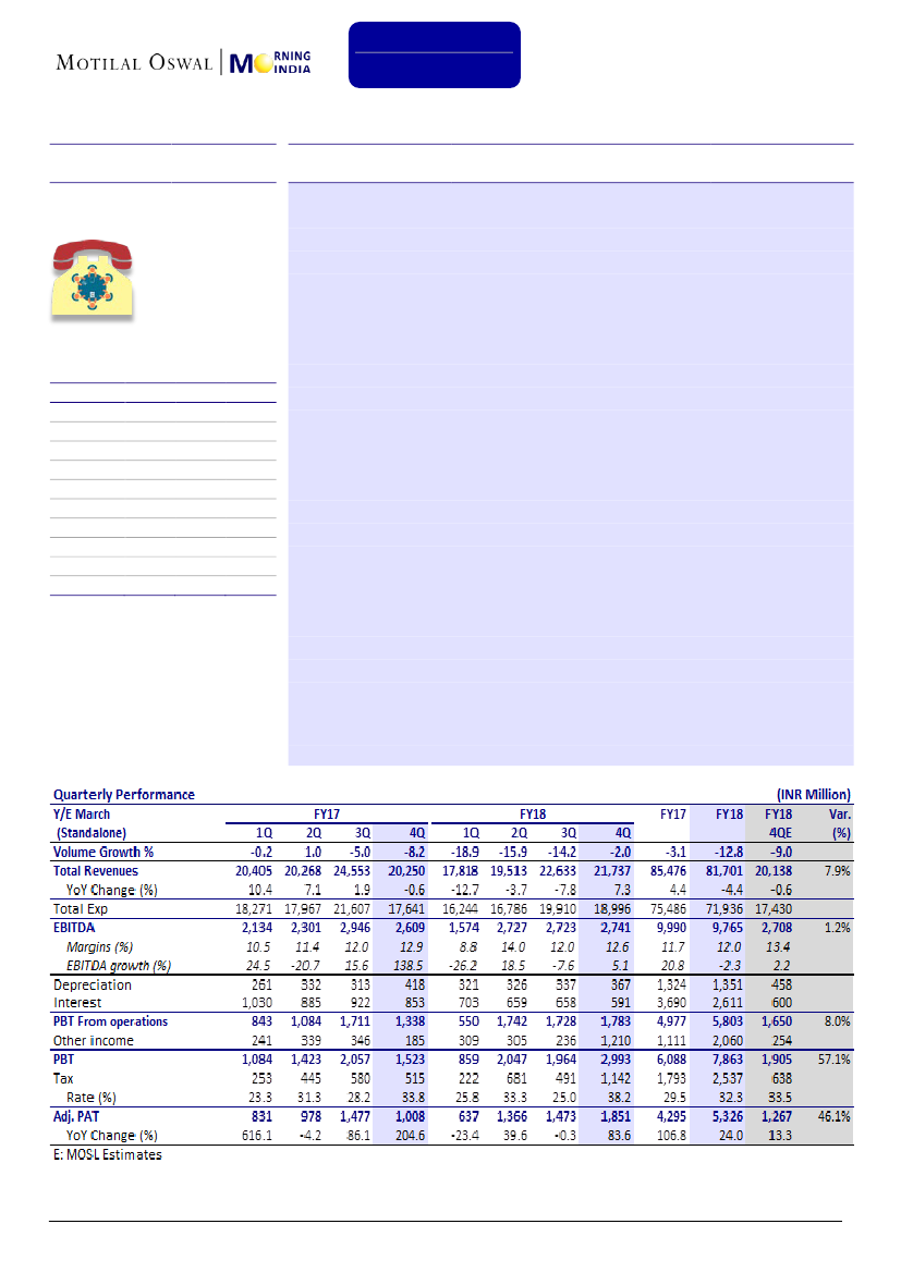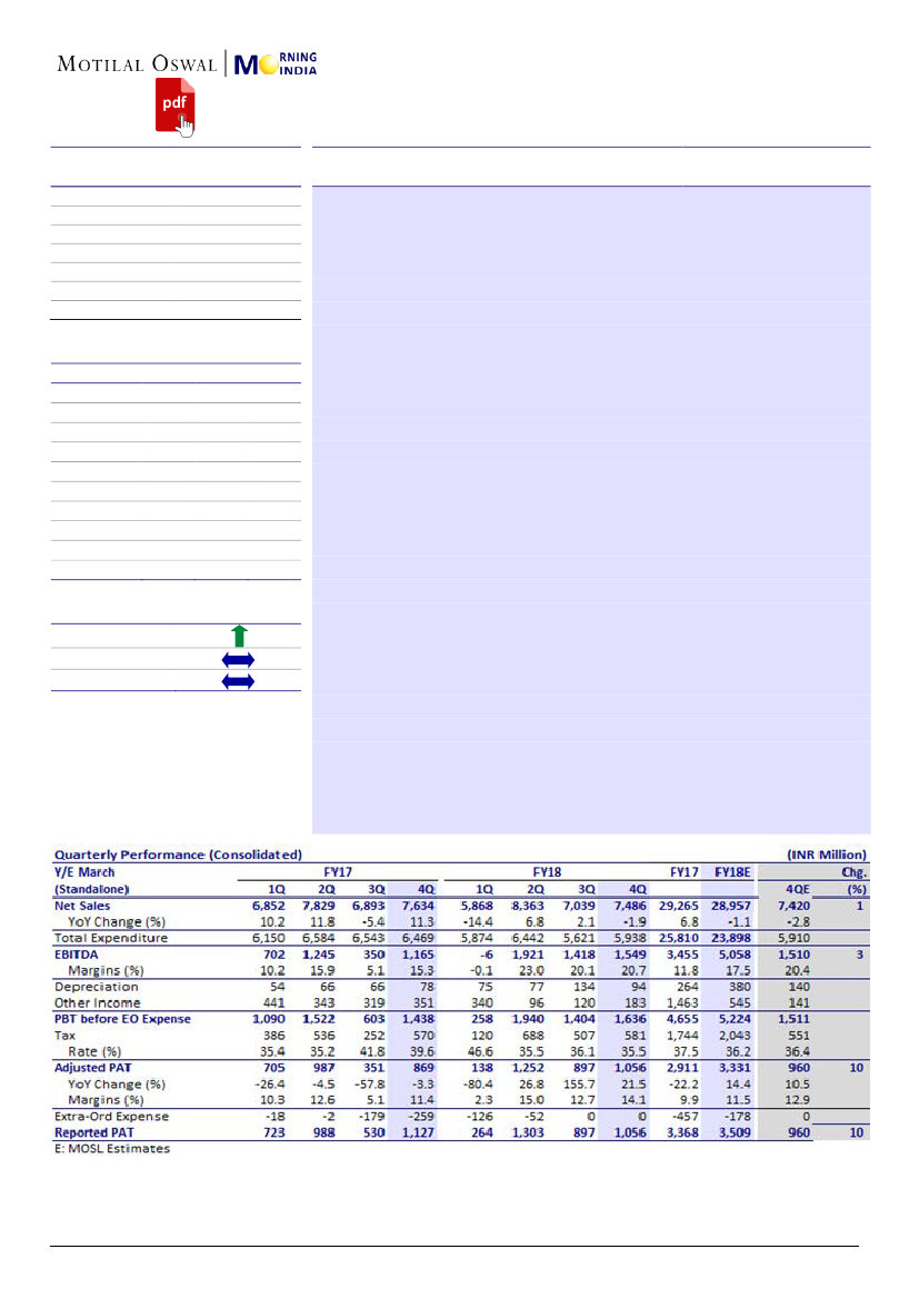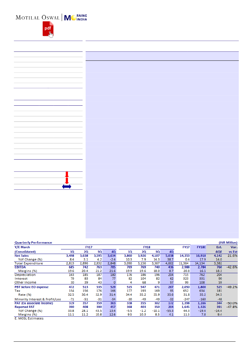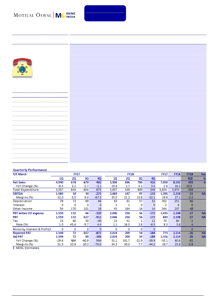 YoY, -53% QoQ). Performance was impacted by higher gas cost in 4QFY18,