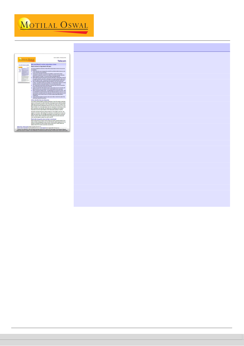 active subscriber additions, while VIL lost a mere 0.3m subscribers in Jan’21.