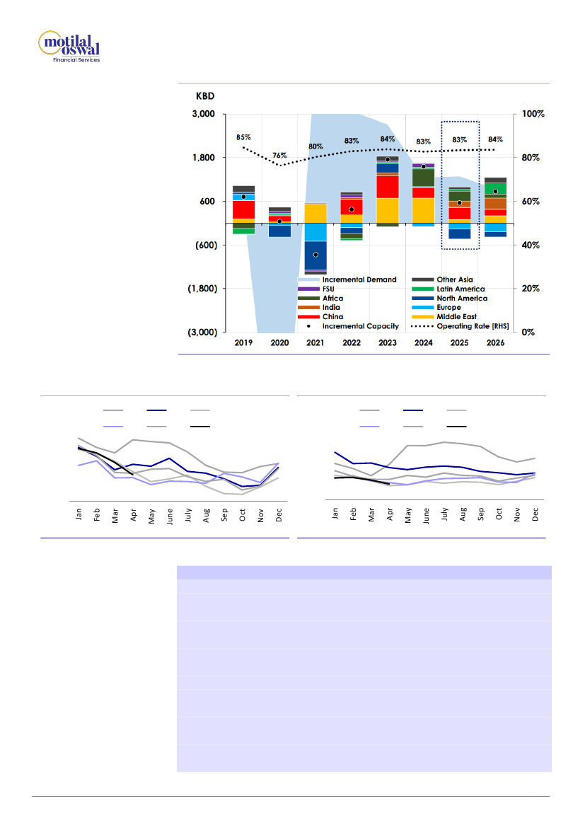 refinery capacity additions globally remain heavy at ~0.4mb/0.95mb per day in CY25/